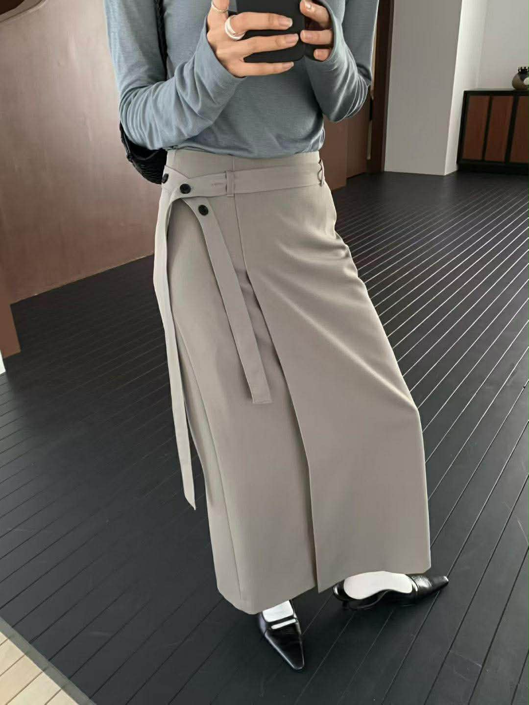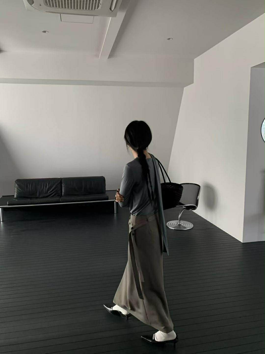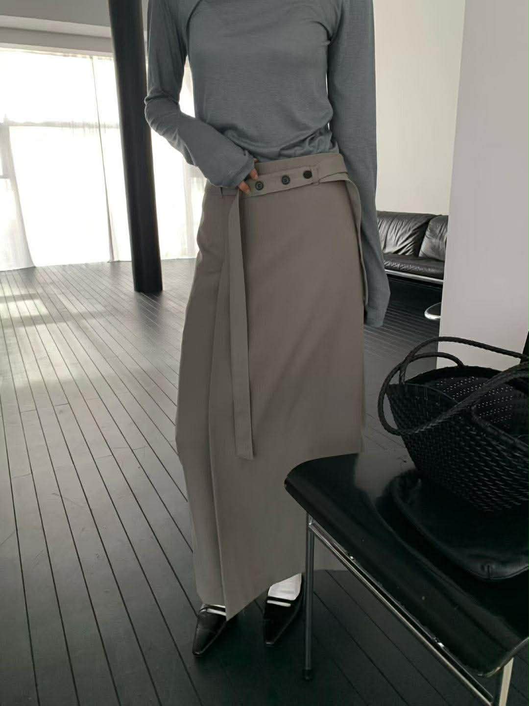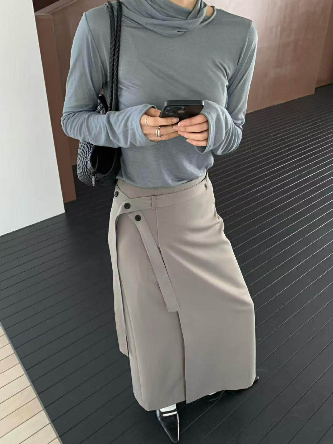 在原本素面的長裙外增加一片交疊感的設計 讓整件極簡的西裝裙多了些許小變化