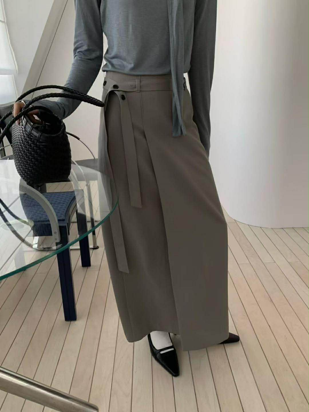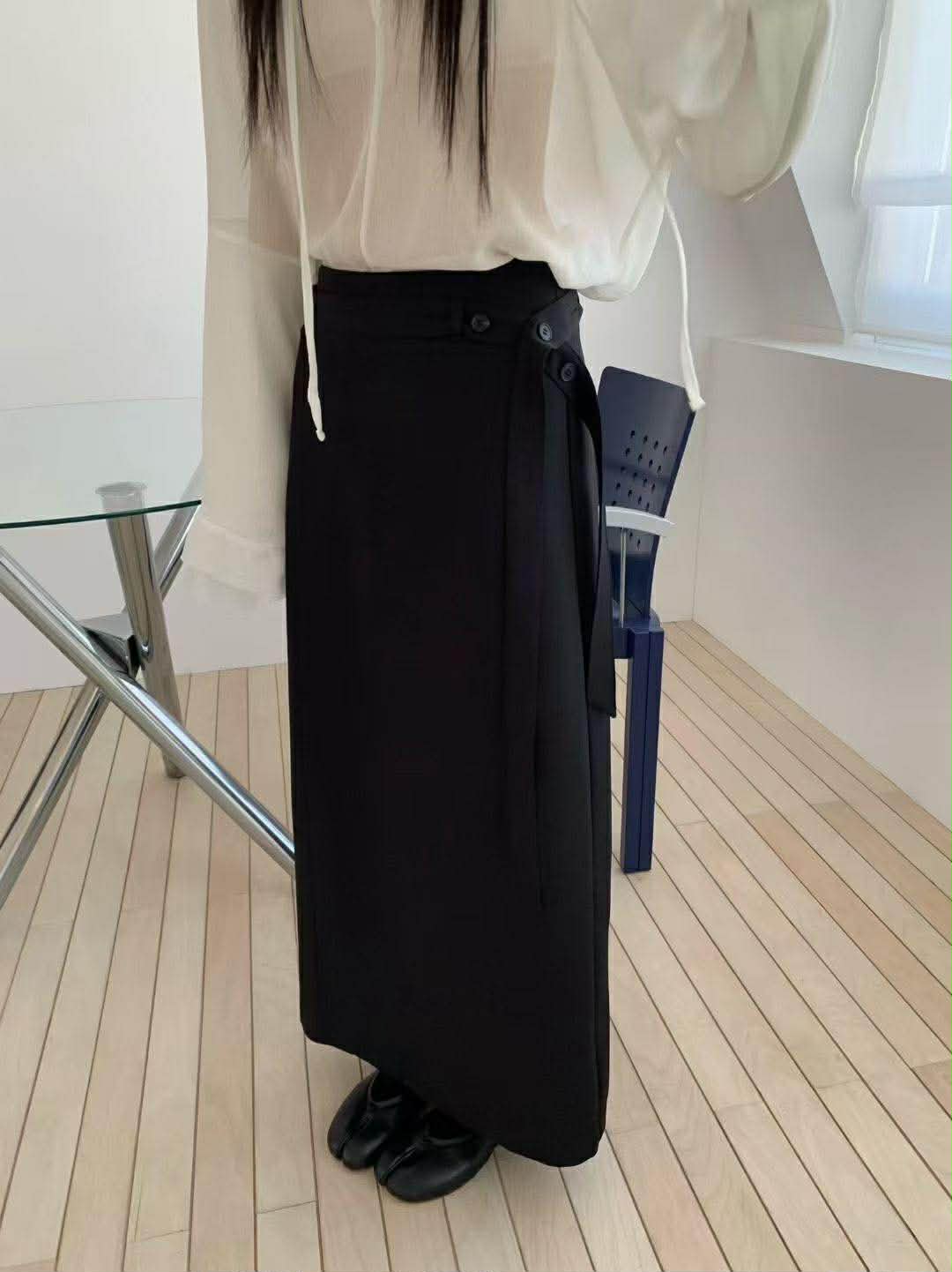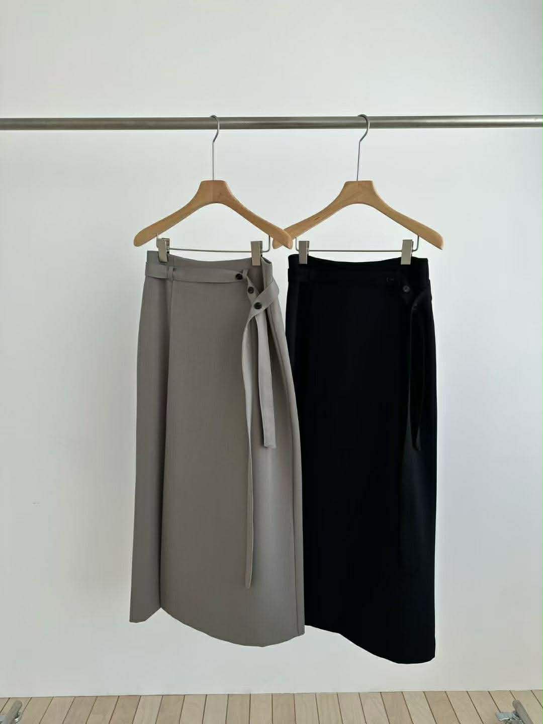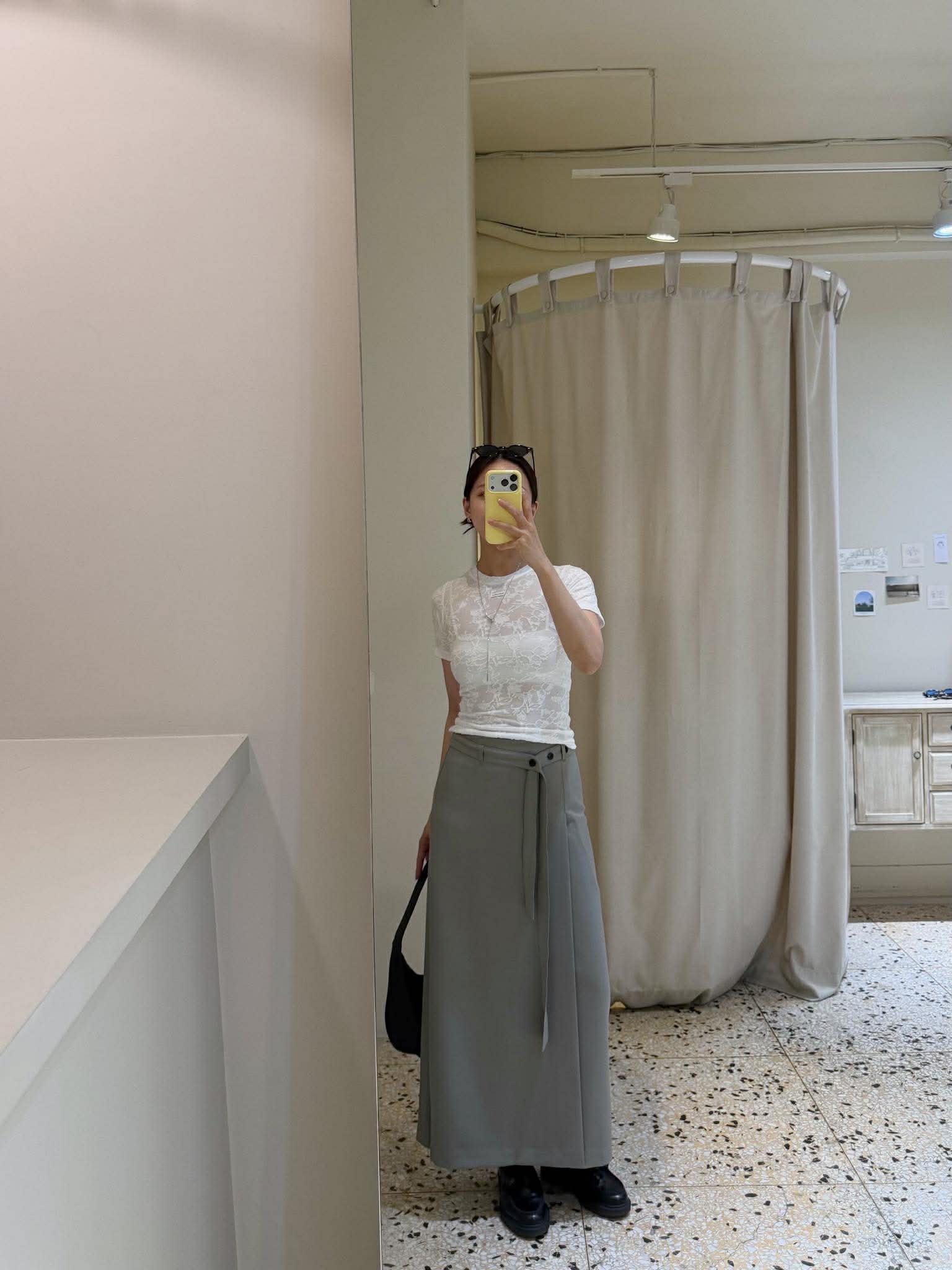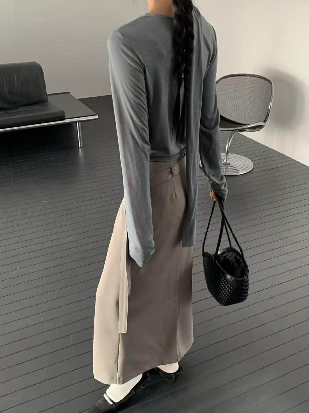 在原本素面的長裙外增加一片交疊感的設計 讓整件極簡的西裝裙多了些許小變化