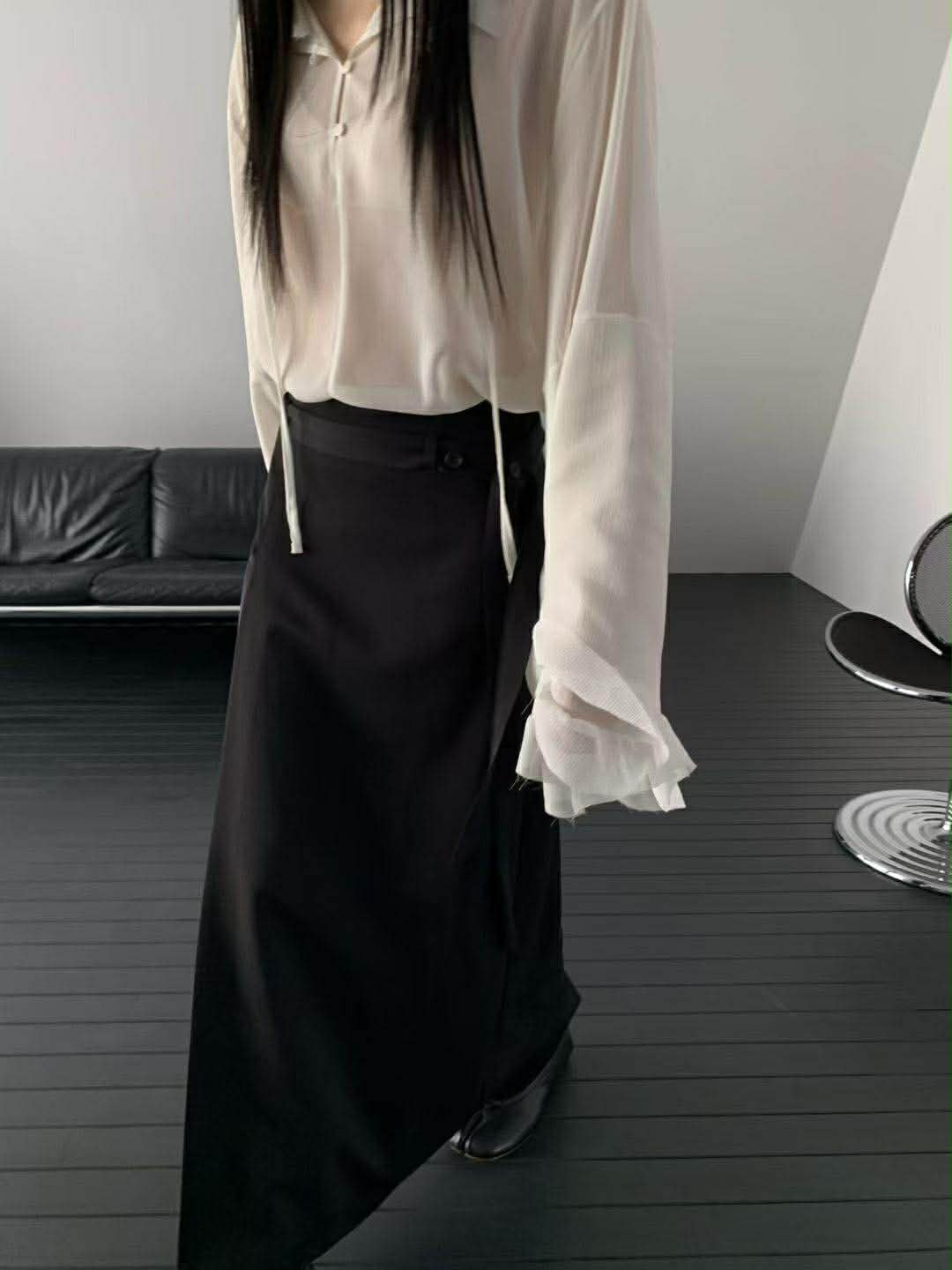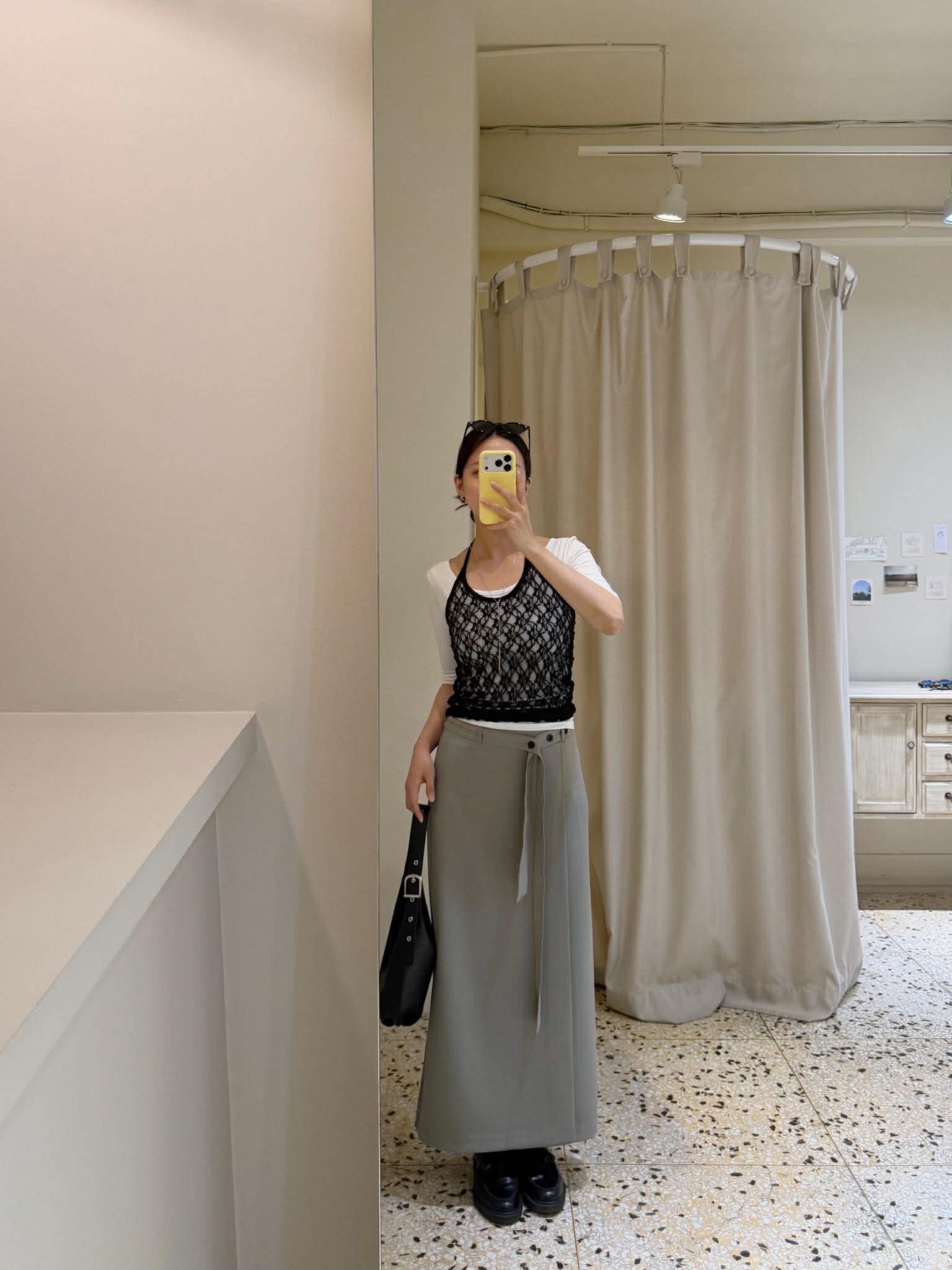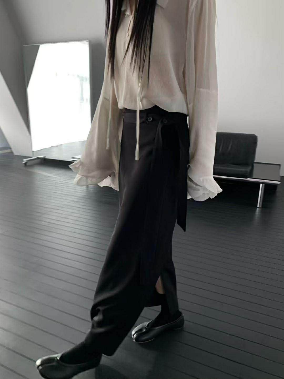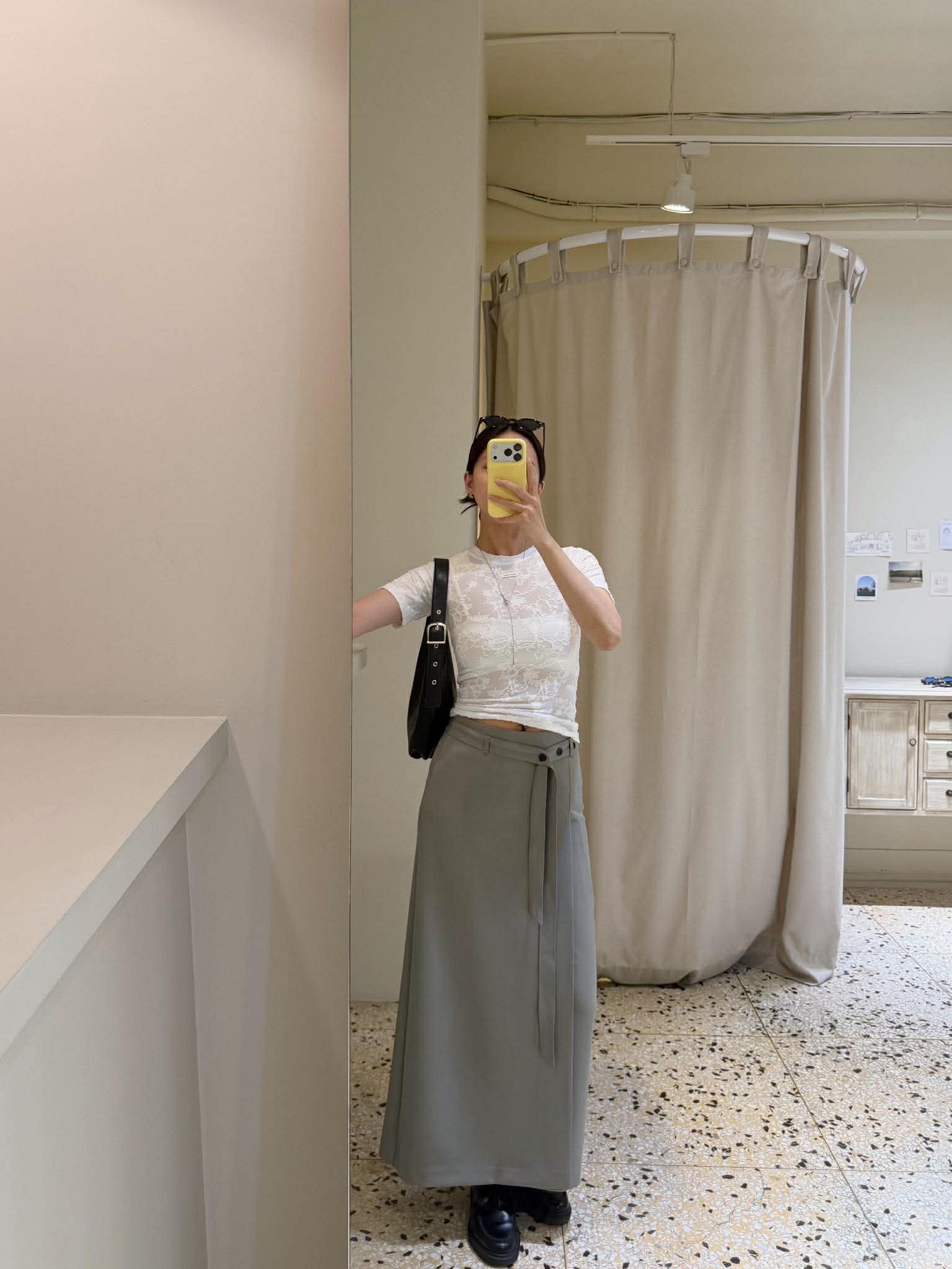 在原本素面的長裙外增加一片交疊感的設計 讓整件極簡的西裝裙多了些許小變化