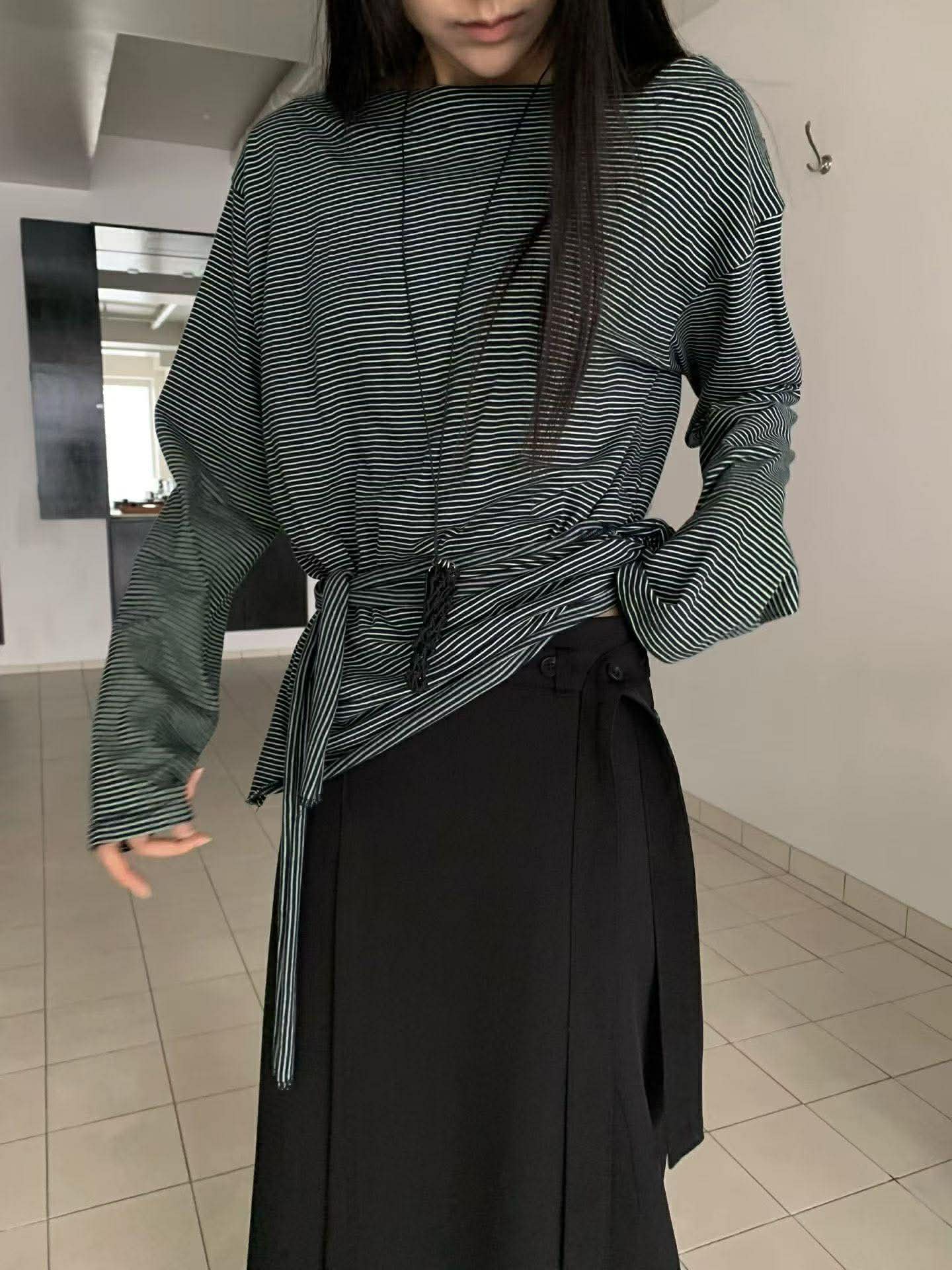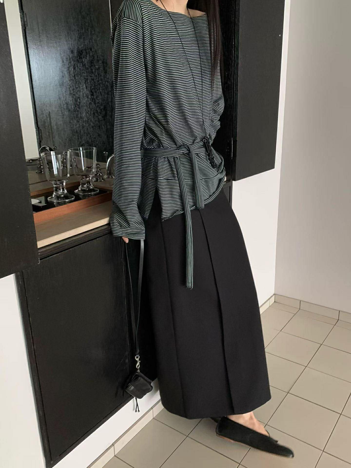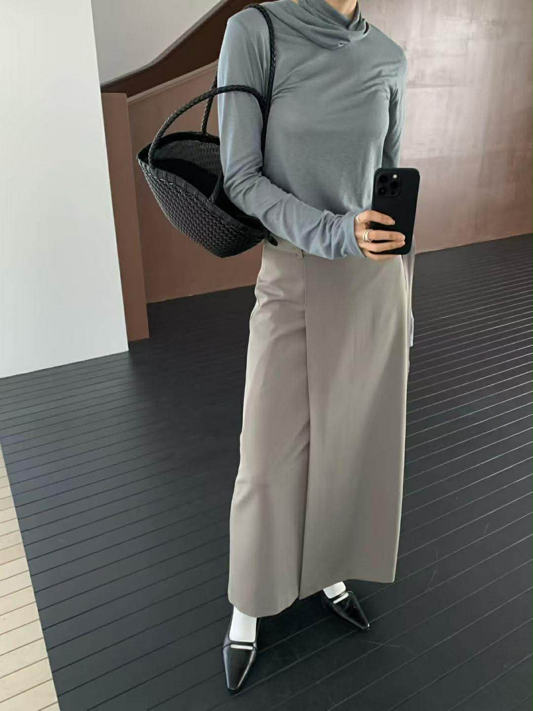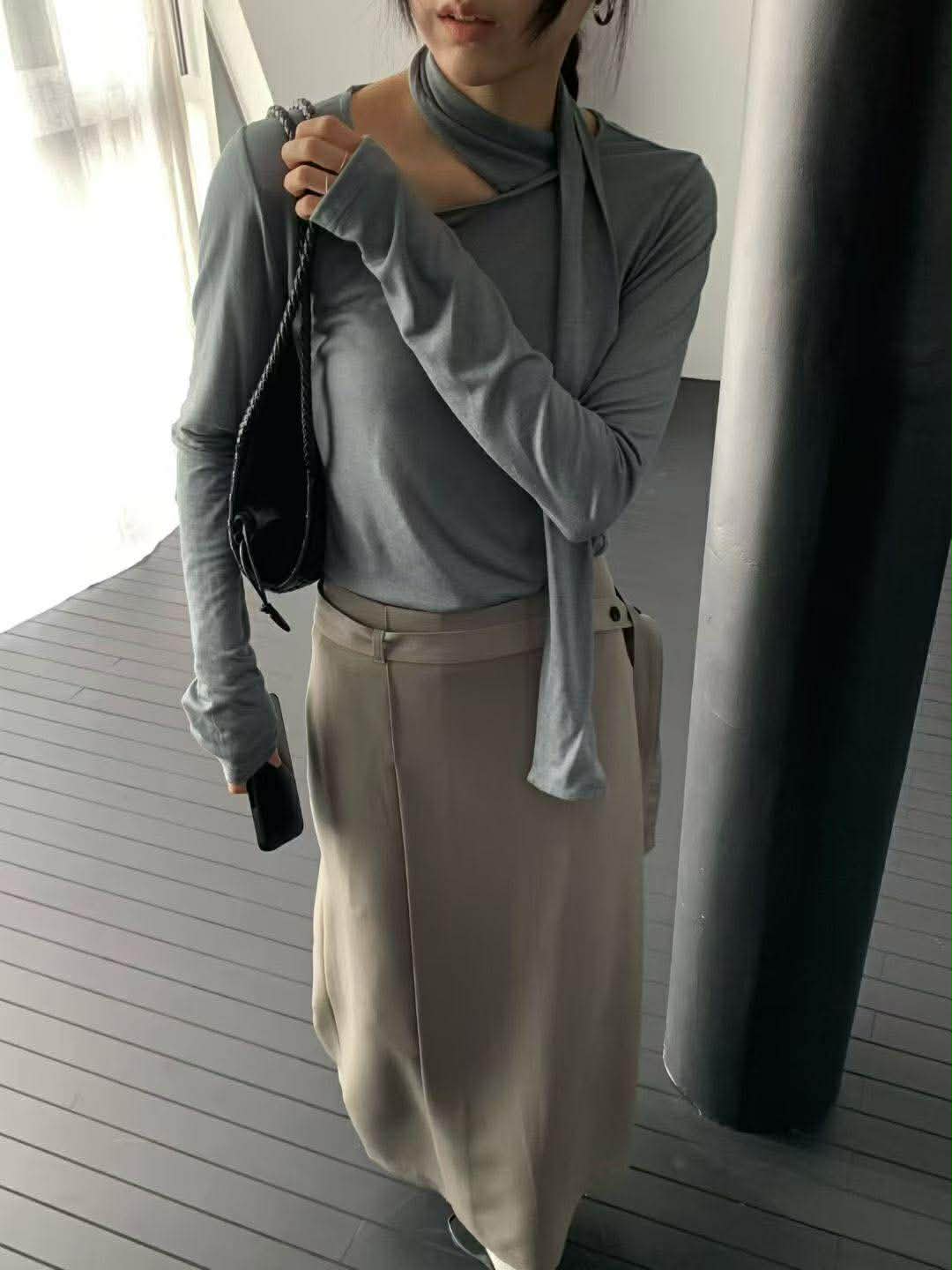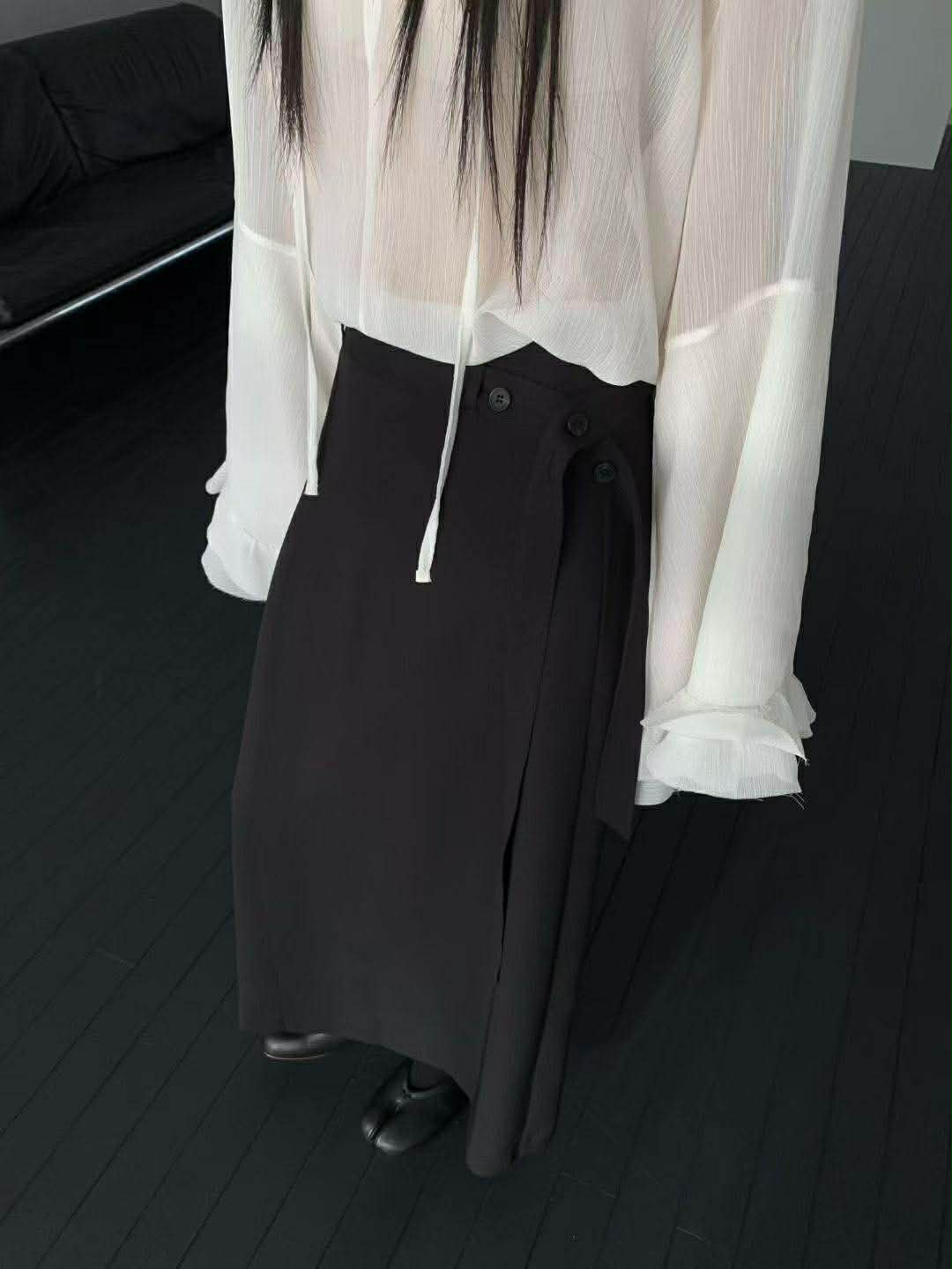 在原本素面的長裙外增加一片交疊感的設計 讓整件極簡的西裝裙多了些許小變化